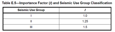 - SUG I, II, III 각각 Importance Factor I=1.0, 1.25, 1.5 (Annex E.5.1.2)